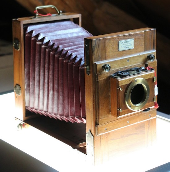 L’image qui accompagne ce texte montre une chambre de voyage 13 x 18 de la fin du XIXe siècle (fig. 1). La chambre se tenait à main levée. Elle entrait facilement, une fois repliée, dans une sacoche. Il s’agit d’un appareil photo haut de gamme, en noyer, aux finitions impeccables, à la réputation de fiabilité et de précision. Elle a été construite vers 1890 par Charles Alibert, dont la boutique s’ouvrait sur le boulevard Saint-Martin à Paris. Il lui manque hélas son optique.