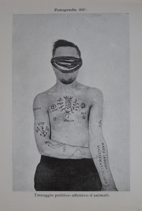 Pourquoi donc ne pas apporter à Turin des résultats aussi excellents que rares à l’époque ? Dans ce choix, le rôle précisément joué par le tatouage dans la définition du criminel chez Lombroso a pesé de tout son poids, ainsi que l’interprétation polémique et stéréotypée que Reiss donnait de son héritage. Dans les écrits de nombre de criminalistes italiens, les tatouages étaient de plus en plus interprétés non comme de simples marques primitivisantes qui caractériseraient le corps du criminel, traces de l’atavisme ou retour en arrière dans le processus évolutif (à l’origine des comportements déviants selon les anciennes théories du maître), mais plutôt comme autant d’iconographies et de messages à décrypter pour avoir accès à la fois à la psychologie, à l’histoire et à l’identité de leurs porteurs (ce qui, à vrai dire, n’était pas hors du champ d’intérêt du psychiatre et médecin-légiste Lombroso).