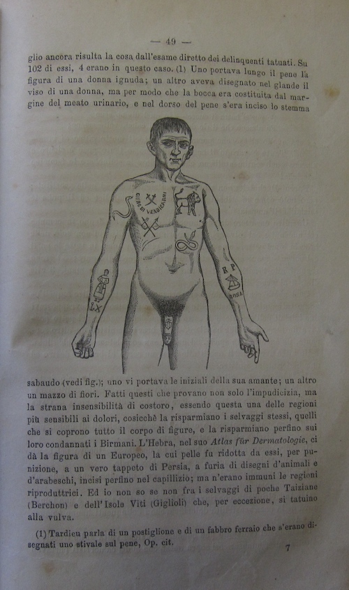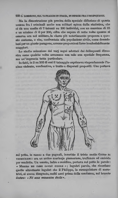9. Cesare Lombroso, Sul tatuaggio in Italia, in ispecie fra i delinquenti. Studio medico-legale (comunicato nell’adunanza del 12 marzo 1874), Reale Istituto Lombardo di Scienze e Lettere, Rendiconti, série 2, vol. 7, 1874, p. 230.