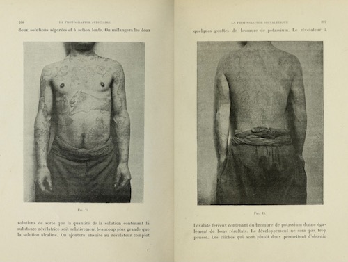 Parmi ces clichés, aucun ne représente de sujets tatoués ou de tatouages. A première vue, cela paraît surprenant. A cette époque, Reiss avait déjà établi le procédé permettant de résoudre les multiples difficultés qui se posaient aux photographes dans la tentative de fixer sur plaque des individus à la peau ornée de tatouages. Après un demi-siècle d’études médico-légales et criminalistes[5], et malgré l’essor d’autres signes désormais plus fiables comme les empreintes digitales, les tatouages demeuraient précieux dans le domaine de l’identification de cadavres, de suspects et de récidivistes, même si le bleu ardoise de l’encre de Chine résistait singulièrement à ressortir de la couleur de la peau sur les clichés.